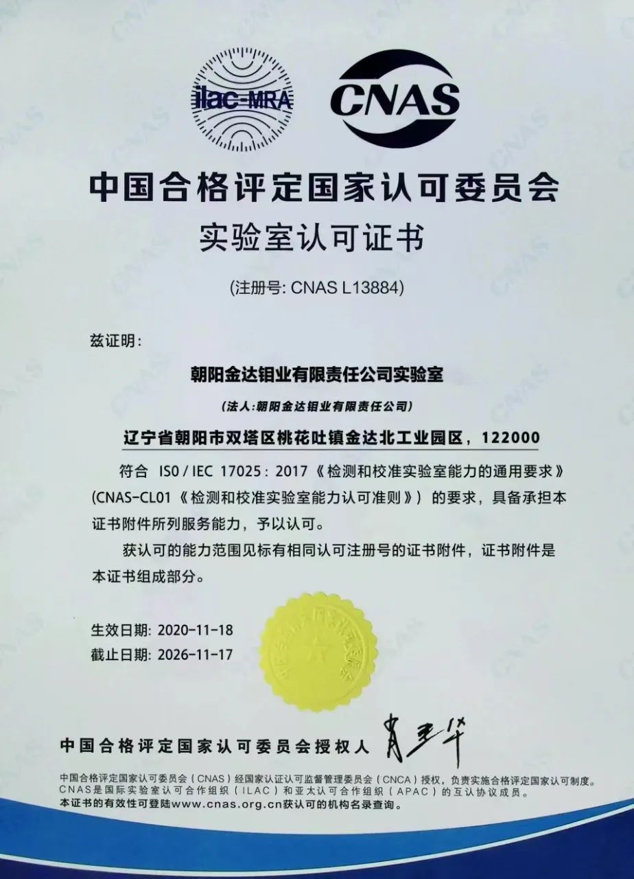 金达钼业实验室于 2020年11月首次成功通过CNAS国家实验室认可。CNAS认可堪称实验室管理及技术能力的璀璨名片。实验室配备国际领先水平的检测设备 “电感耦合等离子体发射光谱仪”,该设备以其卓越的精密度与准确度,为检测工作提供了坚实的硬件保障。同时,实验室团队成员不仅具备深厚的专业知识,还在长期工作中积累了丰富的检测经验。所采用的检测方法均严格依据国家标准与行业规范制定,有力确保了检测结果的精准可靠。